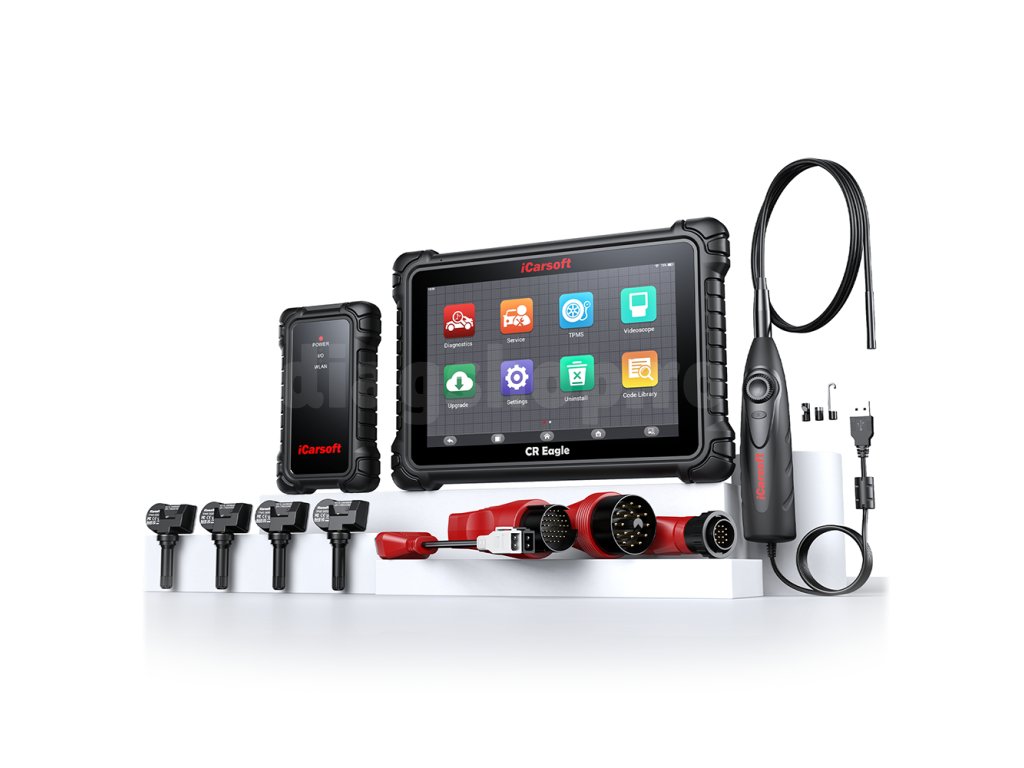 Pe lângă dispozitivul de diagnosticare și adaptorul wireless, iCarsoft CR Eagle include și funcții integrate de codare a supapelor TPMS, 4 supape TPMS, un endoscop flexibil tip "gooseneck" și adaptoare pentru autovehicule mai vechi marca Mercedes și BMW. De asemenea, este inclus un adaptor cu 14 pini pentru modelul Mercedes Sprinter.
